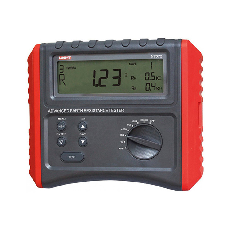ارت سنج پیشرفته یونیتی UNI-T UT572 تستر مقاومت زمین پیشرفته 2 و 3 و 4 سیم دیجیتال دارای صفحه نمایش بزرگ 4 رقمی ال سی دی با زمان نمونه برداری 5 ثانیه و اندازه گیری ولتاژ و فرکانس اختلال، با قابلیت اندازه گیری مقاومت زمین ، RS و RH ، نگهدارنده اطلاعات در صفحه نمایش می باشد و همچنین ارت سنج یونی تی مدل UNI-T UT572 عایق دوگانه و دارای ولتاژ مداخله است که مقدار اندازه گیری را به صورت اتوماتیک در صورت وجود ولتاژ زیاد نگهداری میکند. ارت سنج چهار سیمه بهمراه اندازه گیری مقاومت ویژه خاک یونیتی UNI-T UT 572 یکی از ارزانترین و مجهزتزین ارت سنج های چهارسیمه است که قابلیت اندازه گیری به صورت دو سیمه و سه سیمه را نیز دارد. این ارت سنج چهار سیمه بهمراه اندازه گیری مقاومت ویژه خاک بوده و میتواند آن را به همراه مقاومت زمین ، RS و RH محاسبه کند. قابلیت اندزاه گیری ولتاژ و فرکانس تداخل برای اندازه گیری هرچه دقیق تر در این ارت سنج وجود داشته و شما میتوانید تمام داده ها در قالب یک ست در حافظه 20 تایی این دستگاه ذخیره کنید.این ارت سنج چهار سیمه میتواند تست مقاومت جبرانی RK را نیز داشته باشد. بدنه محکم و یکپارچه ، نمایشگر بزرگ بهمراه نور پس زمینه ، تجهیزات و قرقره سیم ها به همراه میخ ها در یک پک کامل از مهمترین ویژگی ها ظاهری این ارت سنج چهار سیمه بهمراه اندازه گیری مقاومت ویژه خاک است.