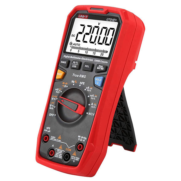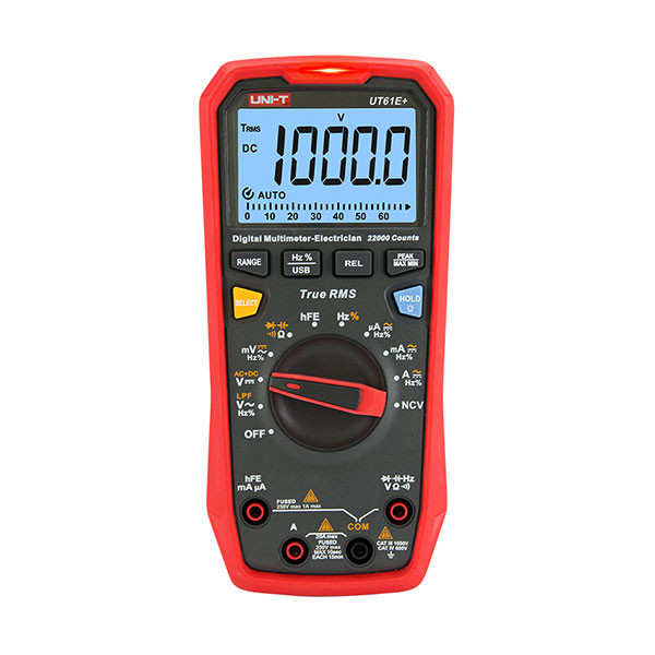 مولتیمتر یونیتی UNI-T UT61E+ True RMS بسیار دقیق و تخصصی می باشد. از ویژگی های آن می توان به اندازه گیری TRUE RMS و فیلتر پایین گذر ولتاژ متناوب و قابلیت اندازه گیری ACV+DCV برای حل کردن مشکلات در اندازه گیری موتور و درایو ها ، تاسیسات اتوماسیون، توزیع برق ، و تجهیزات الکترومغناطیسی اشاره کرد. یونیتی UT61E pluse دارای عملکرد منحصر بفردی در اندازه گیری ولتاژ و فرکانس و دیوتی سایکل و سایر پارامتر ها بر روی تجهیزات الکتریکی می باشد. وضوح بالا ، خوانایی راحت مقادیر ، نمایشگر ال سی دی کریستالی به همراه نور پس زمینه ویژگی های عمومی مولتی متر برای انجام اندازه گیری ها می باشند.دیاکو الکتریک به عنوان عرضه کننده انواع تجهیزات ابزار دقیق، تست و نگهداری تجهیزات صنعتی انواع مولتی متر های یونیتی را همراه با خدمات پس از فروش در بازار داخلی تامین و ارائه می کند. از جمله دیگر ویژگی های مولتیمتر UT61E+ 1000V True RMS محافظت ورودی ها مطابق با استاندارد ایمنی CATIV 600V , CAT III 1000V می باشد که می توانند ولتاژ بیشتر از 8000V ولت را نیز به صورت مقطعی تحمل کند که باعث جلوگیری از سوختن یا غیر فعال شدن دستگاه میشود. مولتیمتر دیجیتال ایمن UT61E pluse 1000V True RMS با تعداد ارقام صفحه نمایش 22000 (+UT61E)، می تواند تا 1000V AC/DC را اندازه گیری کند. این دستگاه مجهز به الارم صوتی و بصری در هنگام اندازه گیری ولتاژ/جریان و درجه حرارت بالا می باشد. مولتی متر های سری UT61 دارای گواهینامه CE و مورد تایید اروپا هستند : درجه 2 آلودگی ، CAT III 1000V و CAT IV 600V . جهت رعایت استانداردهای بین المللی تضمین کیفیت کالا، کمپانی یونیتی در ساخت این محصول از الزامات CE اتحادیه اروپا ؛ ETL آمریکا و کانادا و GS پیروری کرده است. بنابراین شما می توانید با اطمینان از ایمنی و کیفیت این محصول با اطمینان خاطر آن را خریداری نمائید. علاوه براین قاب محافظ این دستگاه از جنس عایق دو جداره می باشد و استحکام دستگاه را برای کاربر تضمین می کند.