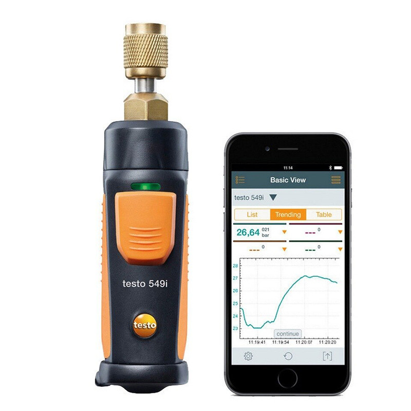 پراب فشار سنج هوشمند و بیسیم تستو مدل Testo 549i یکی از تجهیزات پیشرفته و جدید ساخته شده تحت برند تستو آلمان است که برای اتصال به تجهیزات کنترلی هوشمند نظیر تلفن همراه و تبلت اندرویدی ، IOS طراحی شده است. پراب فشار سنج و وکیوم شارژ گاز کولر هوشمند بیسیم و بلوتوثی تستو TESTO 549i میتواند برای اندازه گیری فشار مخازن فشار بالا و فشار پایین سیستم های برودتی و کولر های گاز، بدون نیاز به شلنگ مورد استفاده قرار بگیرد. این فشار سنج قابلیت اندازه گیری وکیوم تا -1 بار را داشته و از این جهت میتوان در فرآیند شارژ کولر نیز از آن استفاده کرد. این پراب به کمک بلوتوث میتواند به موبایل هوشمند متصل شده و داده را بر روی موبایل نمایش داده شوند. علاوه بر نمایش قابلیت ثبت و ذخیره سازی ، ارسال داده ها بعلاوه نمایش گراف تغییرات توسط نرم افزار بلوتوثی این پراب فشار سنج و وکیوم شارژ گاز کولر وجود دارد. برای اتصال این پراب ابتدا بایستی نرم افزار Smart Probe را بر روی گوشی خود نصب نموده سپس دکمه روی پراب را فشار دهید تا چراغ LED رو دستگاه به رنگ زرد چشمک زن در آید. سپس با روشن کردن بلوتوث موبایل و انجام عملیات جفت شدن دو دستگاه رنگ LED به رنگ سبز تغییر رنگ داده و پراب آماده بکار است. بر روی نمایشگر موبایل نیز مقدار عددی فشار اندازه گیری شده به نمایش در خواهد آمد. نرم افزار SmartProb قابلیت اتصال همزمان 5 پراب هوشمند را داشته و میتواند مقادیر اندازه گیری شده را در قالب فایل PDF و یا Excel ذخیره کرده و از طریق ایمیل ، تلگرام و یا واتس اپ ارسال کنید.