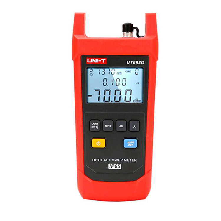 تستر کابل فیبر نوری یونیتی UNI-T UT692D مناسب برای عیب یابی و تعمیر کابل کشی های فیبر نوری با دقت بالا و نتایج قابل اعتماد بیشتر در صنایع مخابراتی کاربرد دارد. این پاورمتر نوری دستی برای اندازه گیری قدرت نوری و همچنین میزان توان تلف شده در طول کابل فیبرهای نوری مناسب است. تستر قدرت کابل فیبر نوری یونیتی مدل UNI-T UT692D محصول بسیار مقاوم می باشد که اگر تا ارتفاع دو متر سقوط کند، مشکلی برای آن پیش نمی آید. بدنه آن دارای استاندارد بین المللی IP65 است. این محصول مقاوم در برابر آب، گرد و غبار و ضربه می باشد. نور زمینه در این دستگاه، استفاده آن در محیط های کم نور را تسهیل می کند. همچنین این دستگاه ها دارای ویژگی هایی از جمله نورپس زمینه، فلش لایت، خاموش شدن خودکار، ذخیره سازی/بازخوانی طول موج، کالیبراسیون توسط کاربر و اندازه گیری رنج وسیعی از توان نوری هستند. علاوه بر این دارای چراغ قوه ای است که سهولت استفاده از آن را دو چندان می کند. دارای نمایشگر باتری کم است. برای صرفه جویی در مصرف باتری، اگر به مدت 10 دقیقه استفاده نشود، به طور خودکار خاموش می شود. دوام باتری آن حداکثر 60 ساعت است. علاوه بر این دارای گواهینامه های CE، RoHS و IP65 است. تستر قدرت کابل فیبر نوری یونیتی مدل UNI-T UT692D در طول موج های 850، 980، 1300، 1310، 1490، 1550، 1625 و 1650 کالیبره شده است که باعث دقت بالای آن می شود.