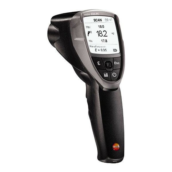 ترمومتر لیزری تستو آلمان مدل 835T1 دستگاهی برای اندازه گیری درجه حرارت به صورت لیزری و غیرتماسی با جسم می باشد. محدوده اندازه گیری به صورت لیزری طیف گسترده ای از محدوده درجه حرارت را پوشش می دهد و سبب کاربرد های فراوان دماسنج تفنگی دو لیزری TESTO 835-T1 شده است، به طوری که رنج اندازه گیری در محدوده -۳۰ درجه تا ۶۰۰ درجه سانتی گراد با دقت اندازه گیری ۲.۰ درجه سانتی گراد و از فاصله دور از جسم می باشد. در دماسنج تفنگی دو لیزری TESTO 835-T1 علاوه بر اندازه گیری به صورت غیرتماسی، امکان استفاده از پراب دمای تماسی نوع K نیز فراهم آمده است تا در صورت نیاز کاربر بتواند اندازه گیری را به صورت تماسی نیز انجام دهد. محدوده اندازه گیری این دستگاه به صورت تماسی در رنج -۵۰ درجه تا ۶۰۰ درجه سانتی گراد می باشد. می توان از این ترمومتر لیزری در تمام بخش های تجاری و صنعتی مانند نظارت و بازرسی سیستم تهویه، نگهداری سیستم های صنعتی یا کنترل کیفیت محصولات استفاده کرد.