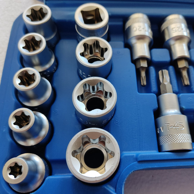 9 عدد سری بکس 1/2 به سایز های : E8.E10.E12.E14.E16.E18.E20.E22.E24 10 عدد آلن بکس ستاره ای به سایز های : T20.T25.T27.T30.T40.T45.T50.T55.T60.T70