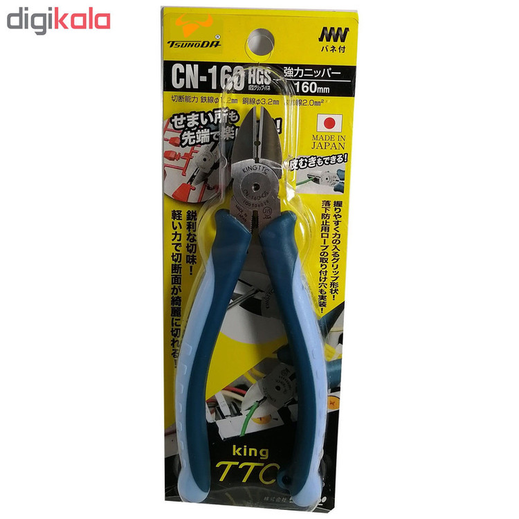سری king ttc از سری محصولات شرکت ژاپنی تسونودا می باشد . از مشخصات بارز این سری می توان به کیفیت و دوام بالا اشاره نمود .انبر سیم چین تسونودا مدل CN-160HGS از محصولات سری king ttc می باشد که تمامی ویژگی های یک سیم چین کامل و عالی را در کنار هم داراست . استفاده از روکش پلاستیکی نرم و منعطف روی دسته ها سبب شده است تا علاوه بر راحتی و خوش دستی از وزن بسیار کمی برخوردار باشد . بدنه این محصول از فولاد کربنی مقاوم ساخته شده است و تیغه ها با نهایت دقت سخت کاری شده اند تا از برندگی بالایی برخوردار باشند . از ویژگی های منحصربفرد سیم چین فوق وجود حفره ای روی تیغه ها می باشد که به عنوان سیم لخت کن می توان از آن استفاده نمود.از سیم چین CN-160HGS می توان برای برش سیم های مسی و فلزی استفاده نمود . ظرفیت برش این سیم چین برای برش سیم های مسی تا 3.2 میلی متر ، آهن نرم 2 و فولاد 1.6 میلی متر می باشد . تمامی محصولات تسونودا ساخت ژاپن می باشد و این موضوع روی بدنه و بسته بندی محصول حک شده است .