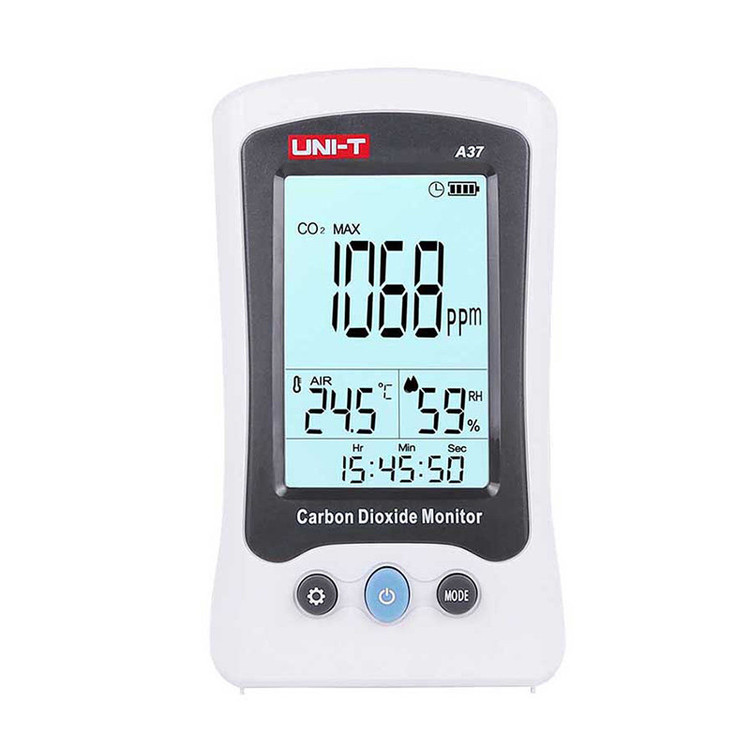 آنالایزر و دتکتور گاز CO2 یونیتی UNI-T A37 یک آنالایزر گاز دی اکسید کربن پرتابل می باشد که کار با آن بسیار ساده است. این دستگاه علاوه بر سنجش میزان دی اکسید کربن قادر است میزان رطوبت و درجه حرارت محیط را اندازه گیری نماید. از قابلیت های این محصول می توان به تصحیح اتوماتیک مقادیر پایه، آلارم دیداری و شنیداری، نشانگر اتمام باطری و خاموش شدن اتوماتیک دستگاه اشاره کرد. این دستگاه در صورتی که مقادیر غلظت Co2 از مقادیر مجاز فراتر رود دستگاه شروع به اخطار تصویری و پخش آلارم می کند.در صورت بلااستفاده بودن دستگاه به مدت بیش از 2 دقیقه به صورت خودکار خاموش می شود و در صورت کاهش باتری به کاربر هشدار لازم داده می شود. دستگاه زمان، تاریخ و مدت زمان لازم جهت اندازه گیری را نیز نمایش می دهد. آنالایزر و دتکتور گاز CO2 یونیتی UNI-T A37 جهت سنجش کیفیت هوا در اماکن بسته مانند منازل، مراکز خرید، داخل اتومبیل و کارخانه ها ایستگاههای قطار و بسیاری موارد دیگر کاربرد دارد. ا این دستگاه به کمک کابل mini USB و باتری لیتیومی خود قابلیت شارژ دارد. از ویژگی های دیگر آنالایزر و دتکتور گاز CO2 A37 قابلیت تصحیح خودکار خط مبنا و نور پس زمینه آن است که در محیط های تاریک به کاربر امکان کار با دستگاه را می دهد.