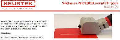 •0302111 – Cutting tool for Scratch test Sikkens NK3000 with 1mm. Blade.•0302112 - Cutting tool for Scratch test Sikkens NK3000 with 2mm. Blade.•0302113 - Cutting tool for Scratch test Sikkens NK3000 with 0,5mm. Blade.•0302114 - 1mm. Blade, Sikkens® original version.•0302115 - 2mm. Blade, complies with standard ISO 12944-6 updated in 2018.•0302116 - 0.5mm. Blade, Daimler Chrysler