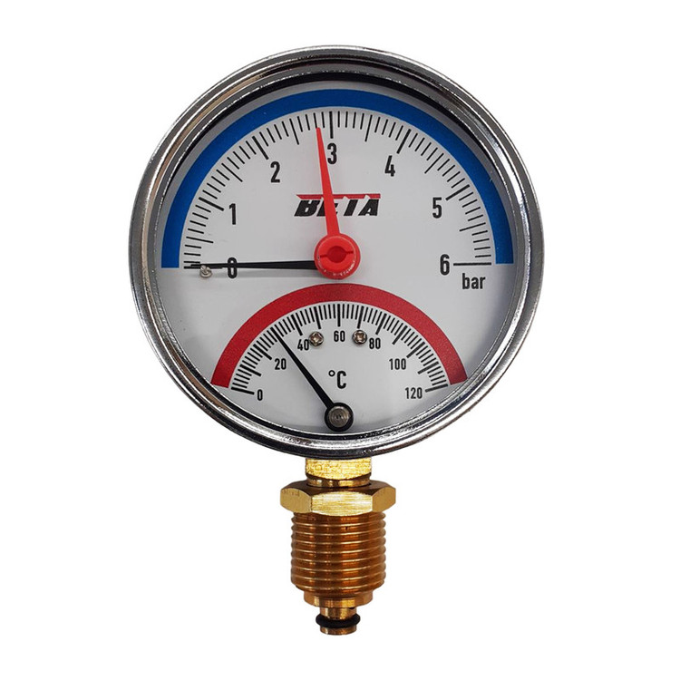 ترمومتر مانومتر بتا یا همان گیج دما و فشار بتا مدل 6bar-120C در یک صفحه به اپراتور میزان دما و فشار را نشان می دهد. که اغلب در سیستم های موتورخانه مورد استفاده می گردد. ترمومتر مانومتر بتا BETA دارای بدنه استیل می باشد و با قطر صفحه 80 میلیمتر ( 8 سانت ) امکان خوبی برای مشاهده دو کمیت دما و فشار در یکجا فراهم می نماید. درب شیشه ای به علاوه رزوه برنجی نیز به استحکام ساختمان این ابزار سنجش کمک شایانی می نماید. کانکشن ترمومتر مانومتر بتا BETA و دیگر تجهیزات داخلی از جنس برنج مرغوب بوده و به صورت اتصال از زیر با اتصال 1/2 اینچ در رنج 120 درجه موجود می باشد