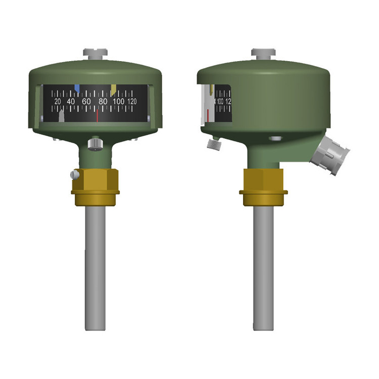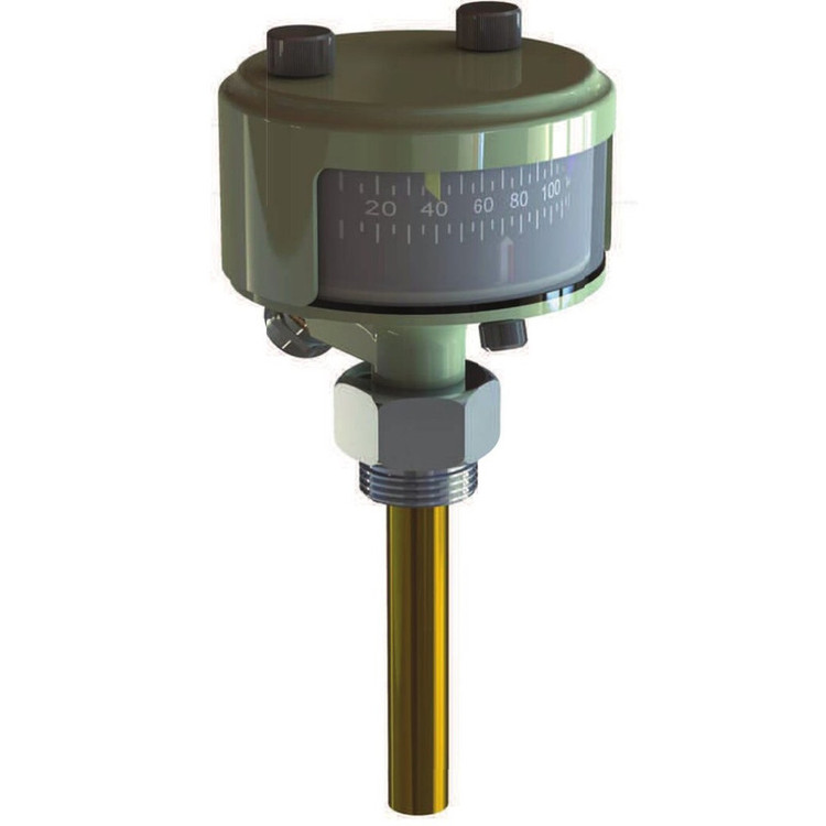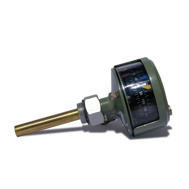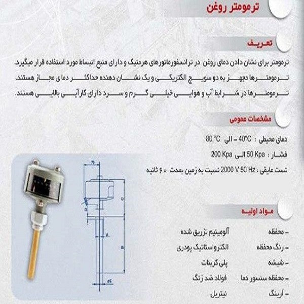 ترمومتر روغن ترانسفورماتور با اطلاع از اثرات مخرب حرارت غیر مجاز بر کیفیت عایق های ترانسفورماتور و با توجه به کلاس حرارتی عایقهای مورد استفاده در آن لازم است دمای روغن در تمامی شرایط کارکرد ترانسفورماتور تحت کنترل باشد.برای این منظور در ترانسفورماتور های روغنی (با منبع انبساط و هرمتیک) از ترمومتر استفاده می شود. نحوه عملکرد ترمومتر روغن ترانسفورماتور توزیع قسمت بی متال(دو فلزی)ترمومتر روغن ترانسفورماتور با حس کردن دمای روغن داخل غلاف موجب تحریک و حرکت عقربه گردیده و دمای روغن را در محدوده دمایی 0 تا 120 درجه سانتیگراد نشان می دهد.در صورت رشد تصاعدی دمای روغن و رسیدن عقربه به شاخص آبی رنگ که اکثراً بر روی دمای 85 درجه تنظیم میگردد،سوئیچ مربوط به آلارم تحریک شده و عمل خواهد نمود.در صورت ادامه افزایش دمای روغن و رسیدن عقربه به شاخص زرد رنگ که بر روی دمای 95 درجه تنظیم شده،میکروسوئیچ مربوط به حالت قطع عمل خواهد کرد.شایان ذکر است این ترمومترها داری یک عقربه نشان دهنده حداکثر دما می باشند که توسط عقربه اصلی حرکت داده می شود و بیشترین دمایی که در حین کار ترانسفورماتور اتفاق افتاده است را نشان می دهد.این عقربه به راحتی پس از بررسی ترانسفورماتور توسط پیچ روی بدنه قابل برگرداندن به حالت اولیه می باشد.جهت نصب ترمومتر روغن ترانس در محل مربوطه که دربالای سیم پیچ قرار دارد،یک غلاف فولادی روی درپوش تعبیه می گردد و قسمت بی متال این ترمومترها توسط پیچ مخصوص بدنه آن در غلاف قرار می گیرد.لازم به ذکر است به علت مسدود بودن انتهای غلاف ترمومتر،روغن داخل آن با روغن ترانسفورماتور ارتباط مستقیم نداشته و این امر موجب قرائت دمای متوسط روغن،همچنین سهولت تعمیر و تعویض ترمومتر میگردد. محصول با کیفیت و اصل، ساخت کشور هند