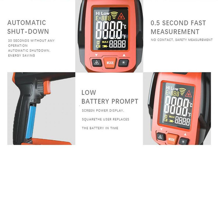 0.5 ثانیه اندازه گیری سریع , بعد از 30 ثانیه بدون فعالیت ، دستگاه به طور خودکار خاموش می شود. نسبت فاصله: 12: 1 میزان انتشار: 1 0.1 1 Ad قابل تنظیم درجه حرارت بالا / دمای پایین لیزر