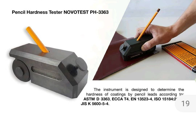 ین ابزار به طور گسترده ای برای تست سختی پوشش های رنگ پودری و مایع استفاده می شود. برای دقت بالای نتایج، سرب مداد باید زیر زاویه 90 درجه تیز شود. آزمایش ها با نرم ترین سرنخ های مداد شروع می شوند. اگر پس از اعمال هیچ نشانه ای از آسیب بر روی پوشش آزمایش شده مشاهده نشد، کاربر باید آزمایش را با سرهای مدادی یک درجه سفت تر تکرار کند. مقدار سختی MAX سرب های مدادی، که هیچ اثری از تخریب بر روی پوشش باقی نمی گذارد، مقدار سختی پوشش آزمایش شده است (به عنوان مثال: 3H، 2H، H، HB، B، 2B، و غیره).
