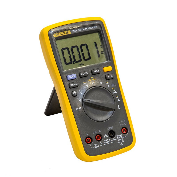 مولتی متر +FLUKE 17B محصول شرکت FLUKE دارای تمامی قابلیتهای لازم جهت تست مدارات و قطعات الکترونیکی می باشد. قابلیت تست دیود, تست خازن،اندازه گیری مقاومت ، اندازه گیری ولتاژ تا 1000V و همچنین اندازه گیری جریان AC/DC تا 10A میباشد. علاوه بر امکانات ذکر شده مولتی متر +Fluke 17B توانائی اندازه گیری دما در محدوده رنجی -40 تا 400 درجه، و اندازه گیری فرکانس تا 100KHz را دارد. برای اندازه گیری دما این دستگاه از ترموکوپل نوع k با کد 80BK-A استفاده می کند که به همراه مولتی متر ارائه می گردد و همچنین پراب اصلی این مولتی متر مدل TL-75 است.