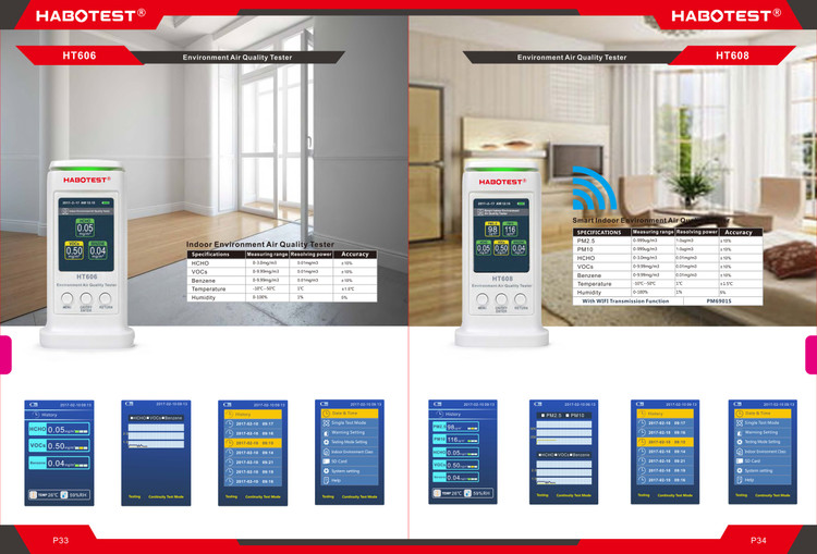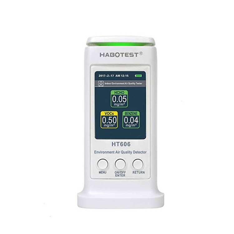 دستگاه HT606، یک انالیزور کیفیت هوا با نمایش به صورت آنالوگ و دیجیتال است که قادراست مجموع ترکیبات آلی (TVOC) و فرمالدئیدHCHO))، بنزن ، دما ، رطوبت را اندازه گیری کند. این دستگاه مناسب برای بهسازی کیفیت هوا منزل و آشکارساز آلودگی هوا می باشد. این دستگاه می تواند مجموع ترکیبات آلی (TVOC) را بین 0 تا 3 mg / m3 با میزان برطرف سازی 0.01 mg / m3 با دقت ±10% اندازه گیری کند