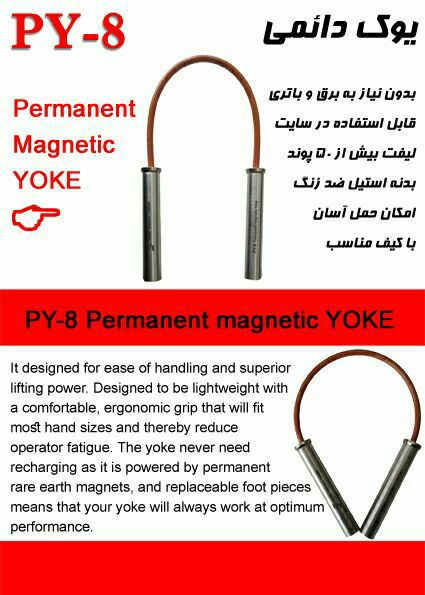 - این یوک به برق و باتری نیاز ندارد و میدان مغناطیسی بسیار قوی را جهت انجام آزمون ذرات مغناطیسی ایجاد می کند.
