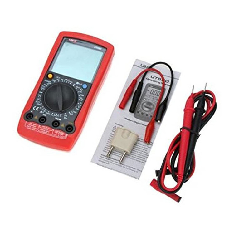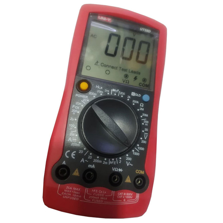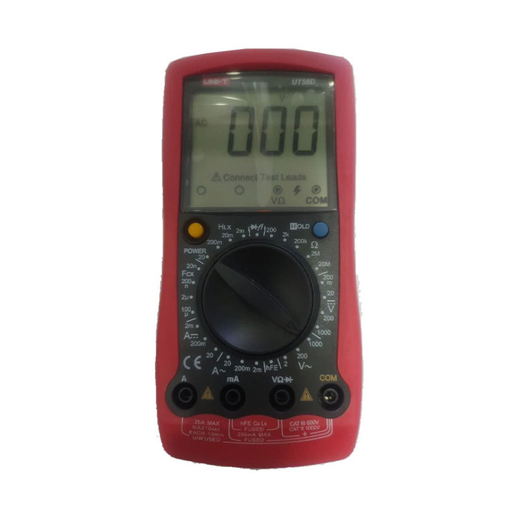 امکانات دو دستگاه در یک دستگاه : مولتی متر + LCR متر دیجیتال UT58Dگرد آمده است . اندازه گیری جریان / ولتاژ / مقاومت / تست دیود و بیزر در کنار اندازه گیری سلف و خازن و تست ترانزیستور با بزرگترین نمایشگر موجود در مولتی مترهای دیجیتال که با انتخاب سلکتور هم روی نمایشگر ترتیب صحیح اتصال پراب ها را نمایش میده تا خطای اپراتور و خرابی را دستگاه را از بین ببرد . اندازه گیری سلف تا 20 هانری دارد . اندازه گیری ظرفیت خازن تا 100 میکرو فاراد دارد . اندازه گیری جریان AC/DC تا 20 آمپر دارد . اندازه گیری ولتاژ AC/DCتا 1000 ولت دارد . اندازه گیری مقاومت تا 20 مگااهم دارد . تست دیود / بیزر / ترانزیستور انجام می شود . کلید پاور ( خاموش/ روشن ) به رنگ زرد روی دستگاه هست . کلید دیتاهلد با رنگ آبی روی دستگاه در دسترس است . سایر متعلقات عبارتند از : پراب / پراب سوسماری / تبدیل تست خازن و ترانزیستور / دفترچه راهنما