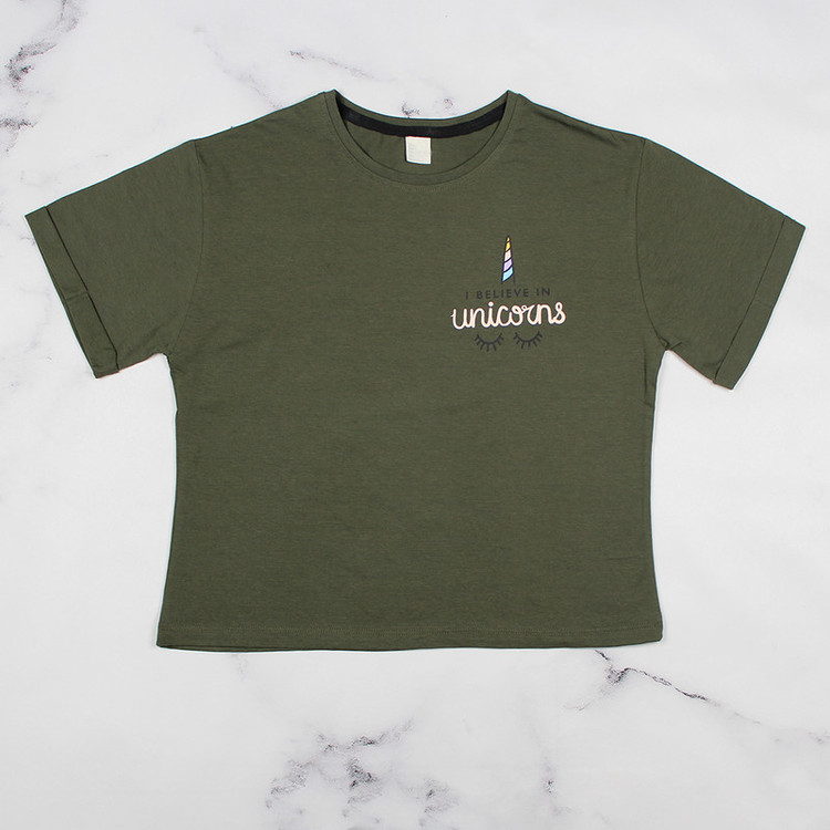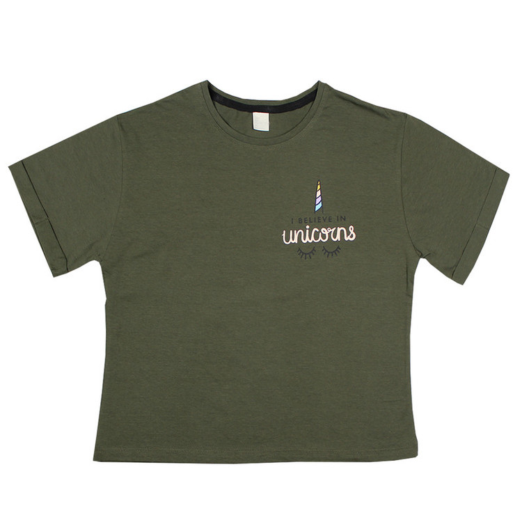پارچه تیشرت نخی سبک (خنک) و راحت می باشد طرح یونیکورن روی تیشرت چاپ شده است