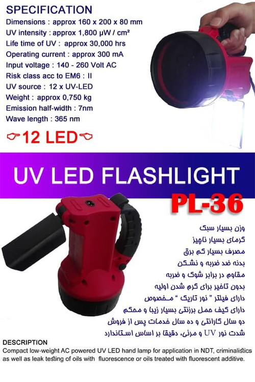چراغ فرابنفش یا ماوراء بنفش یووی UV یا Black Light مدل PL36 (مناسب بازرسی فنی، تستهای غیر مخرب NDT و کارشناسی رنگ خودرو)