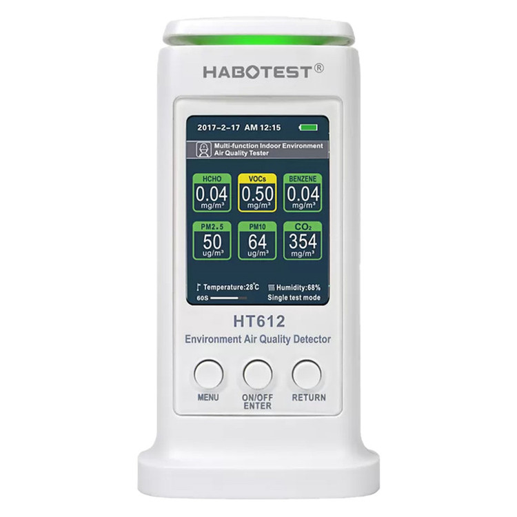 دستگاه HT612، یک سنجش کیفیت هوا در محیط داخلی با نمایش به صورت آنالوگ و دیجیتال است که قادراست مجموع ترکیبات آلی (TVOC) و CO2، بنزن و فرمالدئید (HCHO)، دما ، رطوبت و ذرات معلق در هوا (PM) را اندازه گیری کند. این دستگاه مناسب برای بهسازی کیفیت هوا منزل و آشکارساز آلودگی هوا می باشد. این دستگاه می تواند مجموع ترکیبات آلی (TVOC) را بین 0 تا 3 میلیگرم/مترمکعب با میزان برطرف سازی 0.01 میلیگرم/مترمکعب با دقت ±10% اندازه گیری کند. همچنین فرمالدئید (HCHO) را بین 0 تا 9.99 میلیگرم/مترمکعب با میزان برطرف سازی 0.01 میلیگرم/مترمکعب با دقت ±10% اندازه گیری میکند. این دستگاه بنزن را بین 0 تا 9.99 میلیگرم/مترمکعب با میزان برطرف سازی 0.01 میلیگرم/مترمکعب با دقت ±10% اندازه گیری میکند. میزان اندازه گیری ذرات معلق در هوا (PM2.5) بین 0 تا 999 میکروگرم/مترمکعب با میزان برطرف سازی 1 میکروگرم/مترمکعب و دقت ±10% است و میزان اندازه گیری ذرات معلق در هوا (PM10) بین 0 تا 999 میکروگرم/مترمکعب با میزان برطرف سازی 1 میکروگرم/مترمکعب و دقت ±10% است .دما در این دستگاه وارد شده توسط پترو پژوهش خاورمیانه بین 10 تا 45 درجه سانتی گراد با میزان برطرف سازی 1 درجه با دقت ±1.5 درجه می باشد. میزان کربن دی اکسید در این دستگاه بین 0 تا 3000 PPM با میزان برطرف سازی 1 PPM و دقت 3% است.