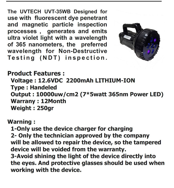 چراغ پرتابل UV TVHFKTA مدل DP یک چراغ قیمت و مناسب و دقیق جهت انجام تست فلورسنت PT و MT است. این دستگاه نور فرابنفش با طول موج 365nm از خود ساتع می کند. و برای کارهای میدانی، آزمایشگاههای پایه جوش و مراکزی آموزشی تستهای غیر مخرب ابزار بسیار ماسبی می باشد. این دستگاه توسط جریان برق مستقیم کار میکند. لامپ های آن طول از جنس led با طول عمر بالا هستند که اصلا داغ نمیشوند. بلافاصله بعد از اتصال به برق دستگاه آماده کار است.