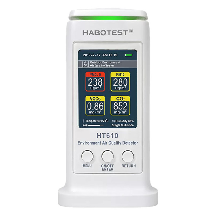 دستگاه HT610، یک سنجش کیفیت هوا در محیط داخلی با نمایش به صورت آنالوگ و دیجیتال است که قادراست مجموع ترکیبات آلی (TVOC) و CO2، دما ، رطوبت و ذرات معلق در هوا (PM) را اندازه گیری کند. این دستگاه مناسب برای بهسازی کیفیت هوا منزل و آشکارساز آلودگی هوا می باشد. این دستگاه می تواند مجموع ترکیبات آلی (TVOC) را بین 0 تا 9.99 میلیگرم/مترمکعب با میزان برطرف سازی 1 میلیگرم/مترمکعب با دقت ±10% اندازه گیری کند. این دستگاه دما را بین 10 تا 45 درجه سانتی گراد با میزان برطرف سازی 1 درجه با دقت ±1.5 درجه می باشد.این دستگاه وارد شده توسط پتروپژوهش خاورمیانه همچنین میزان رطوبت بین 10 تا 90% با میزان برطرف سازی 1% و دقت 5% را اندازه گیری میکند. میزان اندازه گیری ذرات معلق در هوا (PM2.5) بین 0 تا 999 میکروگرم/مترمکعب با میزان برطرف سازی 1 میکروگرم/مترمکعب و دقت ±10% است و میزان اندازه گیری ذرات معلق در هوا (PM10) بین 0 تا 999 میکروگرم/مترمکعب با میزان برطرف سازی 1 میکروگرم/مترمکعب و دقت ±10% است . میزان کربن دی اکسید در این دستگاه بین 0 تا 3000 PPM با میزان برطرف سازی 1 PPM و دقت 3% است.