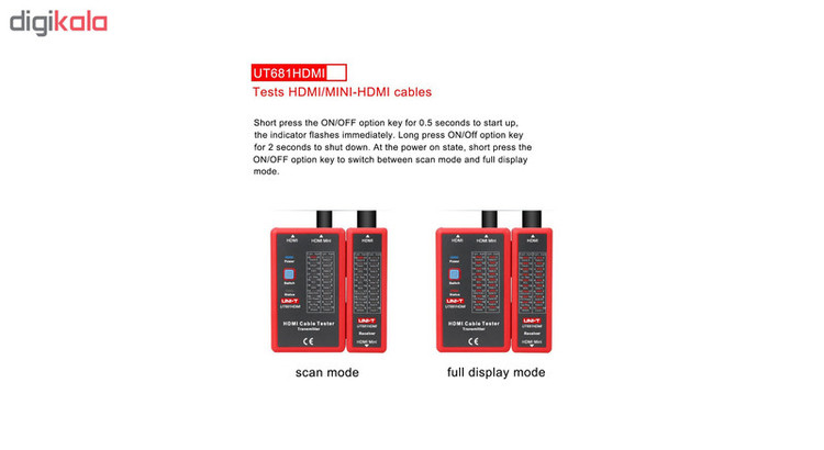 یکی از تولیدات این برند ، تستر کابل HDMI / mini HDMI یونی تی مدل UT681HDMI می باشد. این دستگاه برای تست سلامتی یا خرابی کابل HDMI و MINIHDMI می باشد. در خیلی از مواقع در کارهایی مثل نصب نوت بوک، کامپیوتر ها، DVR که نیاز به کابل HDMI با متراژ بالا می باشد. گاهی به دلیل عدم هماهنگی فرکانس یا هرتز دستگاه و یا خرابی ، کابل تصویر نمی آید. از این رو با استفاده از این تستر میتوان کابل معیوب را پیدا کرد و کابلی سالم را جایگزین آن کرد.. به عبارت دیگر تستر کابل شبکه UT681HDMI برای بررسی کابل ها از لحاظ پارگی ، اتصال کوتاه ، قطع شدن کابل ها در کمترین زمان و با دقت بالا این ابزار ایده آل برای تکنسین ها جهت نصب - نگهداری و بازرسی مدار سیستم های جریان ضعیف هستند. این محصول دارای طراحی منحصر بفرد و با رعایت استاندارد های جهانی می باشد. رنگ غالب بدنه این محصول قرمز و مشکی می باشد.