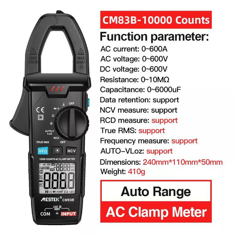 اندازه گیری ولتاژ AC/DC، جریان AC، مقاومت، ظرفیت خازن، فرکانس، چرخه کاری، دیود، تداوم و سیم برق و تست NCV با عملکرد هشدار خاموش شدن خودکار: حدود 15 دقیقه چراغ قوه LED داخلی، مناسب برای استفاده در شب یا محیط تاریک دهانه فک: 30 میلی متر