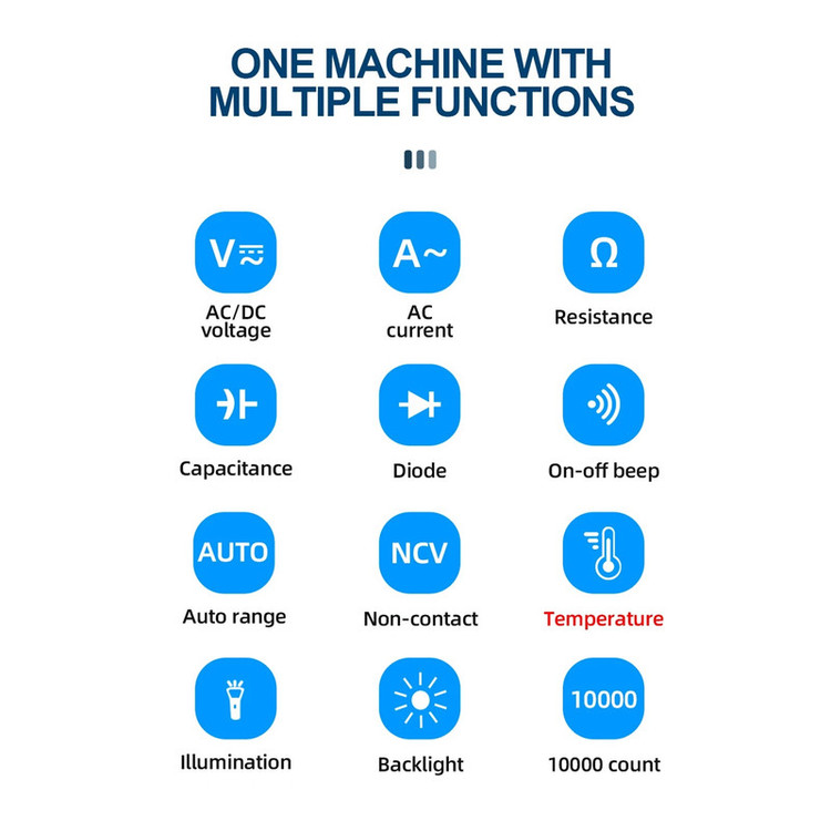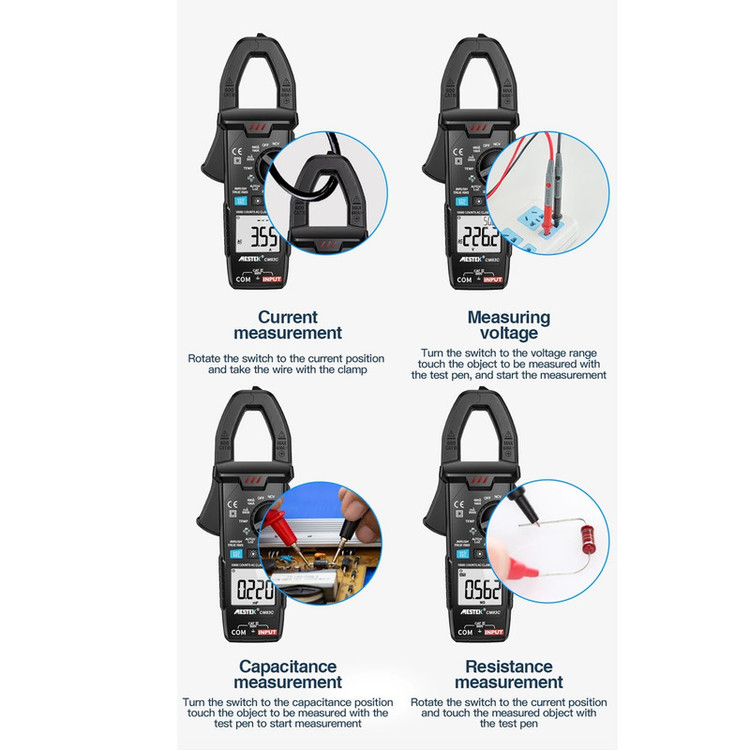 اندازه گیری ولتاژ AC/DC، جریان AC، مقاومت، ظرفیت خازن، فرکانس، چرخه کاری، دیود، تداوم و سیم برق و تست NCV با عملکرد هشدار خاموش شدن خودکار: حدود 15 دقیقه چراغ قوه LED داخلی، مناسب برای استفاده در شب یا محیط تاریک ، دهانه فک: 30 میلی متر