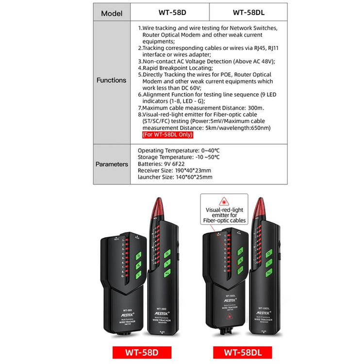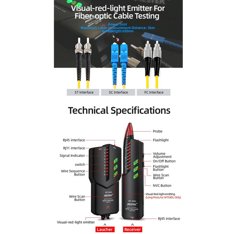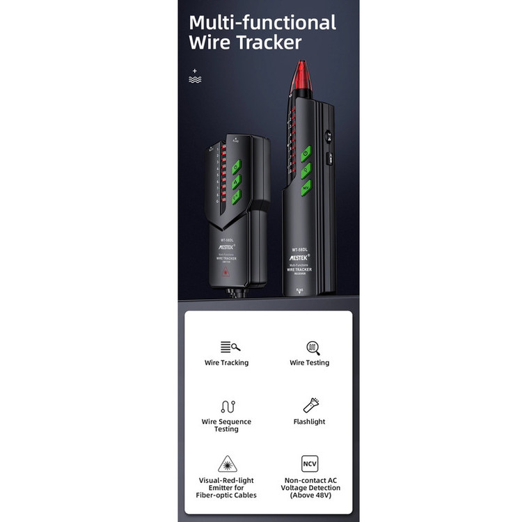 شرکت شنزن مستک تولز یکی برترین تولید کنندگاه ابزار آلات اندازه گیری دقیق با 15 سال سابقه در کشور چین میباشد . محصولات این شرکت شامل محصولات اندازه گیری الکترونیک، صنعت صدا و نور، سنجش حرارت، اپتیک و فاصله سنج های لیزی و هچنین دوربین های تصویری میباشد.این دستگاه یک ردیاب سیم چند منظوره شامل فرستنده و گیرنده کابل می باشد. دارای عملکردهایی مانند ردیابی سیم تلفن، ردیابی سیم شبکه، ردیابی کابل برق، بررسی سیم شبکه وتست کابل فیبر نوری و غیره است و اندازه گیری های سریع و دقیق را انجام می دهد. ابزاری تست برای مهندسی مخابرات، مهندسی سیم کشی و تعمیر و نگهداری شبکه می باشد.