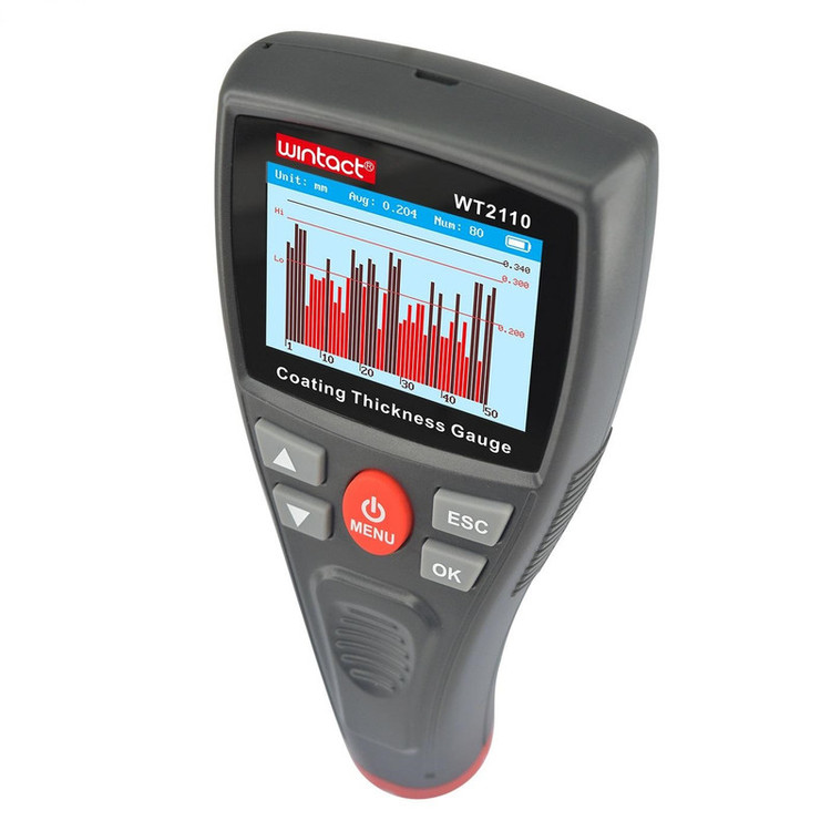 دستگاه ضخامت سنج رنگ WT2110B یکی از جدیدترین ضخامت سنج های ساخته شده با صفحه کاملا رنگی است که به صورت شارژی عمل میکند این دستگاه پوشش را روی کلیه سطوح فلزی نمایش میدهد . این دستگاه ضخامت سنج رنگ جدید دارای نرم افزار حرفه ای و دارای بلوتوث میباشد . یکی از کاربرد های این ضخامت سنج استفاده این دستگاه در کارشناسی رنگ خودرو میباشد .روش تست رنگ شدگی بدنه خودرو با دستگاه دیجیتال تستر رنگ WT2110B : این روش مطمئن ترین روش تست رنگ خوردگی بدنه اتومبیل است و وقتی استفاده می شود که همه روش های قبلی نتوانند وجود رنگ خوردگی روی بدنه ماشین را اثبات کنند. با این دستگاه ضخامت رنگ در نقاط مختلف ماشین اندازه گیری می شود و از طریق اختلاف ضخامت رنگ در نقاط مختلف و متقارن ماشین به رنگ خوردگی خودرو پی خواهیم برد.اگر اختلاف ضخامت رنگ در قسمتی از بدنه 50 میکرون به بالا نسبت به نقاط دیگر بود نشان می دهد که آن قسمت ماشین رنگ خوردگی دارد.ضخامت سنج رنگ دوکاره آهنی و غیرآهنی مدل WT2110B ، به لحاظ بازه اندازه گیری وسیع آن که تا 1500 میکرون است و سبکی و راحتی استفاده ، هم در تشخیص رنگ شدگی بدنه خودرو و هم در ضخامت سنجی رنگ و پوشش به صورت صنعتی کاربری گسترده دارد.