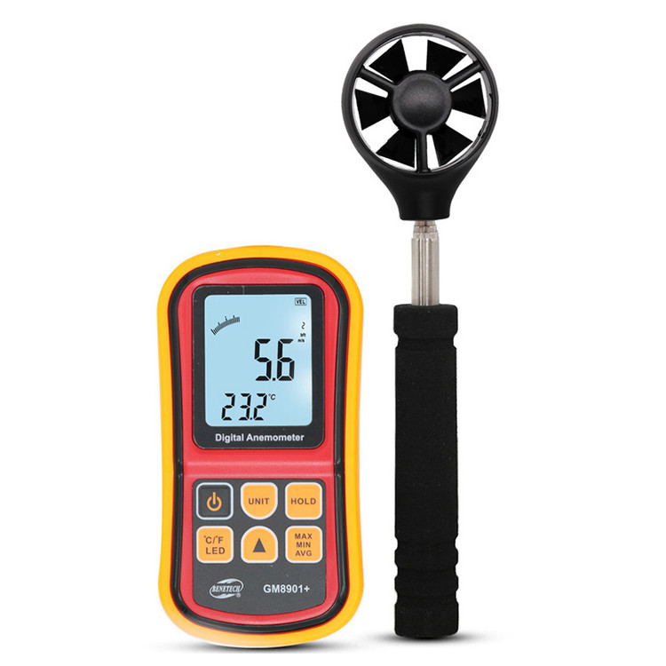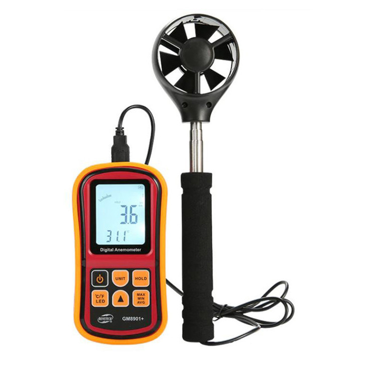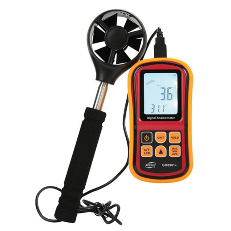 آنمومتر و ترمومتر دیجیتال بنتک مدل +BENETECH GM8901 میتوان جهت اندازه گیری سرعت باد و اندازه گیری دمای محیط استفاده کرد. دماسنج این محصول میتواند دما را تا رنج 45 درجه سانتیگراد و با واحدهای سانتیگراد و فارنهایت نمایش دهد. همچنین سرعت باد را تا رنج 45 متر بر ثانیه و با واحدهای متر بر ثانیه، کیلومتر بر ساعت، فوت بر دقیقه، مایل بر ساعت و گره نشان دهد. این بادسنج، علاوه بر نمایش اطلاعات اندازه گیری شده، میتواند مقادیر ماکزیمم، مینیمم و میانگین را محسابه کند. کاربر میتواند پراب میله این بادسنج را بلند یا کوتاه کند. همچنین خاموشی را میتوان به صورت دستی انجام داد و یا به صورت خاموشی خودکار قرار داد. علاوه بر این دارای نمایشگر کاهش باتری نیز هست. بادسنج و حرارت سنج دیجیتال بنتک مدل +BENETECH GM8901 دارای نور پس زمینه برای صفحه نمایشگر است که استفاده را در فضاهای کم نور ممکن می سازد.