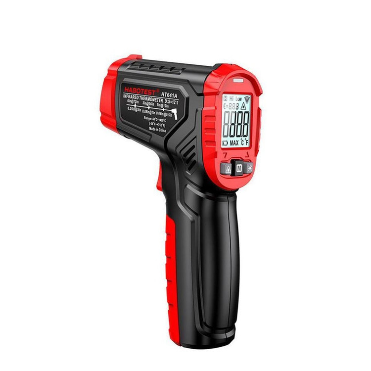 ترمومتر لیزری HABOTEST HT641A با برند هابوتست دستگاهی با ویژگی سنجش میزان دما در بازه 50- تا 400 درجه سانتی گراد است. این محصول ویژگی تنظیم ضریب تابش از 0.10 تا 1.00 متغیر و قابل تنظیم است. ترمومتر لیزری فوق با تابش اشعه مادون قرمز میتواند دمای محیط را حتی از فاصله دور اندازه گیری کند. استفاده در : معاینه و کنترل کیفی محصولات، ماشین های صنعتی، HVAC (گرمایش، تهویه و تهویه مطبوع) ،منازل و اتومبیل .