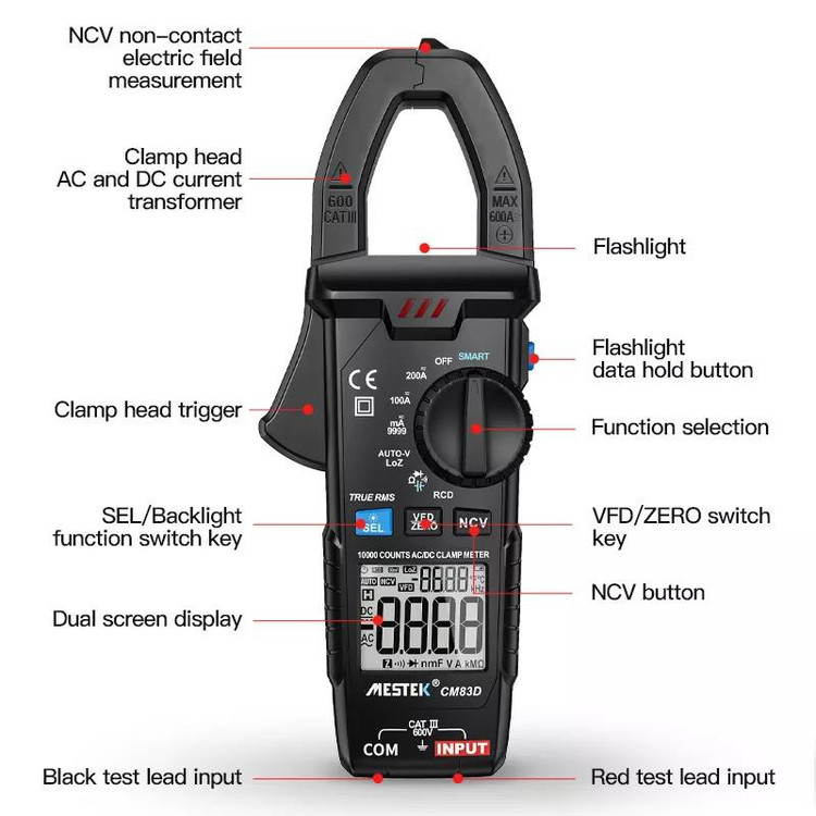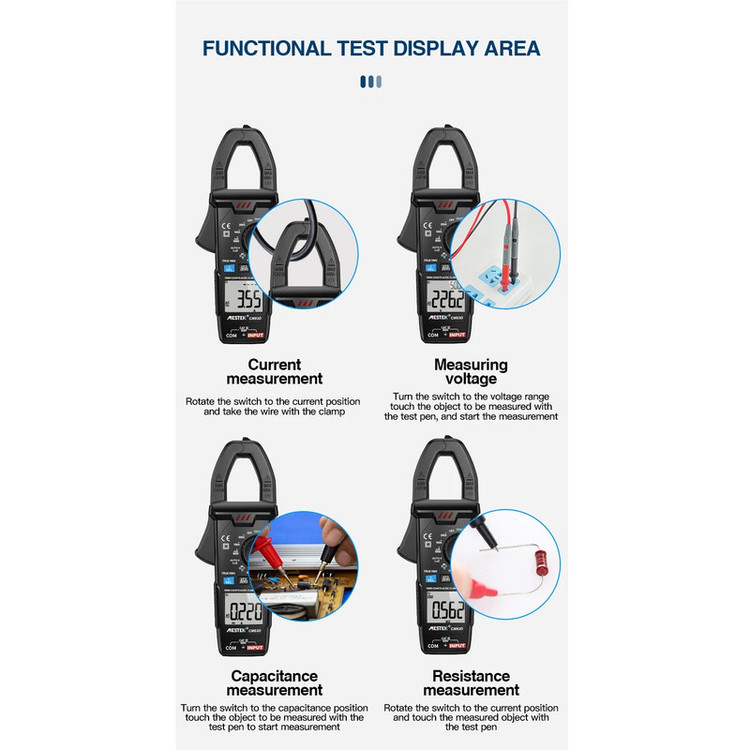 سایر توضیحات : اندازه گیری ولتاژ AC/DC، جریان AC/DC، مقاومت، ظرفیت خازن، فرکانس، دیود، تداوم و سیم برق و تست NCV با عملکرد هشدار خاموش شدن خودکار: حدود 15 دقیقه چراغ قوه LED داخلی، مناسب برای استفاده در شب یا محیط تاریک دهانه فک: 30 میلی متر