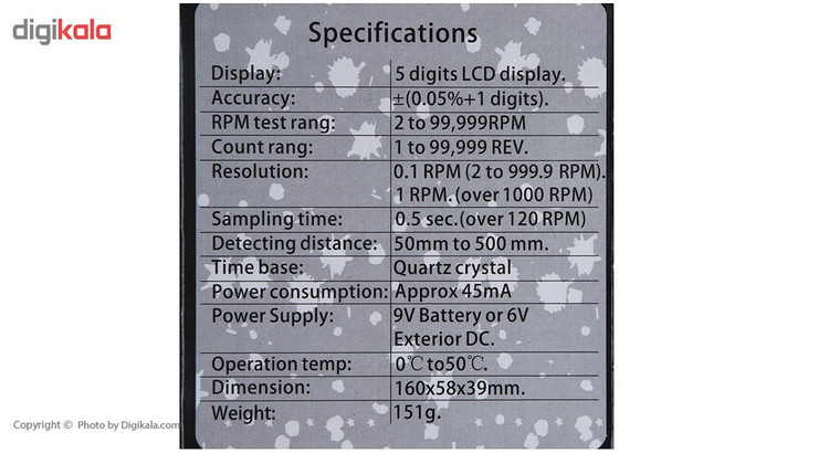 محصول فوق یکی از تولیدات شرکت «سی ای ام» (CEM) بوده و نوعی ابزار اندازهگیری محسوب میشود. این دستگاه در واقع برای اندازهگیری سرعت چرخش یک جسم دوار مورد استفاده قرار میگیرد. این دورسنج برای انجام این کار از یک لیزر کلاس 2برخوردار بوده و همین موضوع موجب شده تا بتوان از آن بهشکل غیر تماسی برای اندازهگیری سرعت چرخش استفاده کرد. حداکثر سرعتی که این دستگاه میتواند اندازهگیری کند، سرعت چرخش 99999 دور بر دقیقه است. برای استفاده از این دستگاه دور سنج باید آن را در فاصلهی 50 تا 500 میلیمتری از سطح مورد نظر قرار دهید. این محصول انرژی مورد نیاز خود را از یک باتری کتابی تامین میکند اما میتوانید با تهیهی یک آداپتور 6 ولت، آن را به برق شهر نیز متصل کنید و سرعت چرخش را اندازهگیری نمایید. دستگاه فوق دارای یک نمایشگر LCD بوده و به همراه یک کیف محافظ عرضه میشود. شرکت سی ای ام این محصول را تحت عنوان مدل AT-6 به بازار عرضه میکند.
