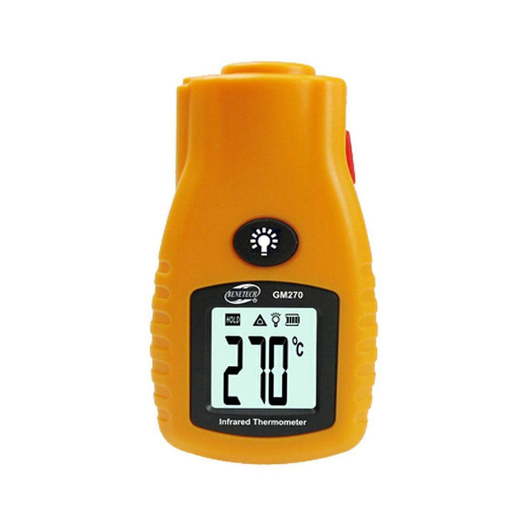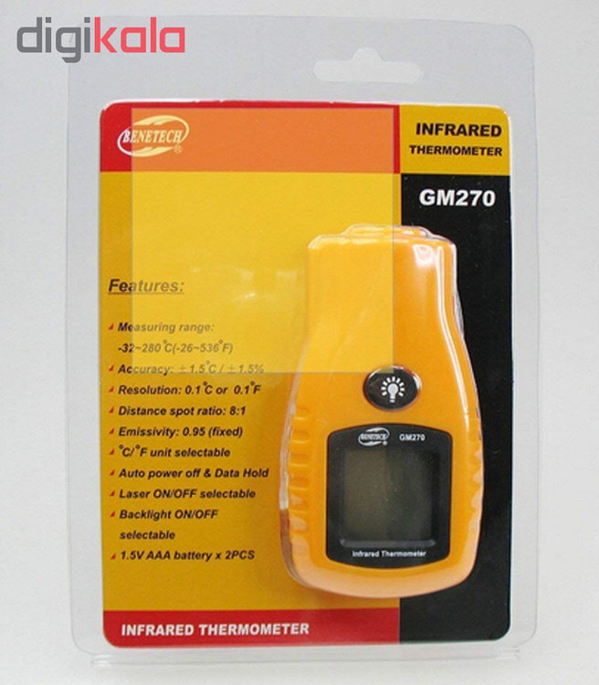 ترمومتر GM270 معروف به ترمومتر دیجیتال جیبی و مناسب کاربری های مختلف آزمایشگاهی و صنعتی است. محدوده اندازه گیری دما از -32 تا 280 درجه سانتی گراد با دقت 1.5 درجه سانتی گراد میباشد. نسبت فاصله به قطر دایره اندازه گیری دما 8 به 1 و حساسیت دمایی ثابت 0.95است. دکمه HOLD جهت ثابت کردن مقادیر اندازه گیری شده بر روی نمایشگر دماسنج تعبیه شده. این محصول دارای نشانگر لیزر جهت اندازه گیری محل دقیق اندازه گیری دما بر روی سطوح و همچنین ویژگی خاموشی خودکار جهت صرفه جویی در میزان شارژ باتری و افزایش عمر باتری است.تغذیه تنها با استفاده از دو عدد باتری قلمی 1.5 ولتی و امکان استفاده طولانی از آن صورت می گیرد.