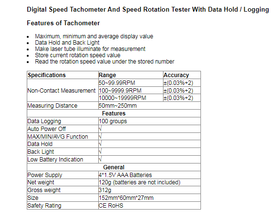 رنج اندازه گیریNon-contact Measurement: 50~19999rpmقابلیت ذخیره سازی داده100 گروه دادهنوع سنسورغیر تماسی لیزریقابلیت آمارینمایش ماکسیمم و مینیمم و میانگینخاموش شدن اتومات صفحه نمایشدراد