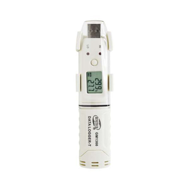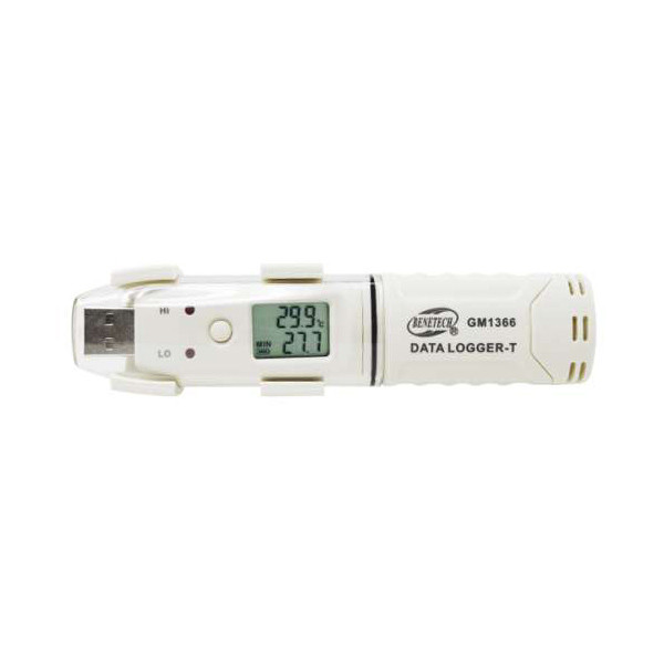 دیتالاگر دیجیتالی دما BENETECH GM1366 قابل استفاده برای ثبت مقادیر دما در محدوده 30- تا 80 درجه سانتیگراد با دقت 0.5 ± درجه سانتی گراد محصول شرکت بنتک است. این محصول از نوع USB و دارای بلوتوث برای انتقال راحت داده ها بین دستگاه و کامپیوتر و تلفن همراه کاربر میباشد. این دیتالاگر دارای حافظه به مقدار 61440 داده برای ذخیره مقادیر است.