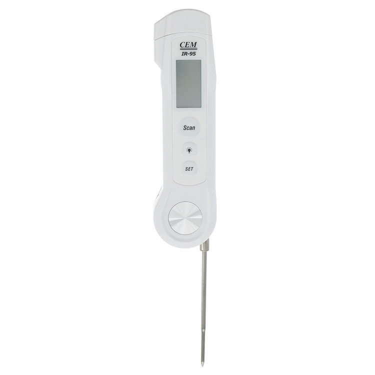 دماسنج نفوذی تاشو/غیرتماسی CEM IR-95 یک دماسنج غیرتماسی لیزری(مادون قرمز) و تماسی توسط پراب برای خواندن دمای نفوذی، بخصوص در مواد غذایی و پخت و پز استفاده میشود. دارای شمارشگر معکوس تا زمان پایان پخت و قابلیت اندازه گیری دما میباشد. دارای صفحه نمایش باکیفیت و واضح جهت نمایش اطلاعات، و همچنین دستگاه دارای استاندارد ضد آب و غبار IP67 است.