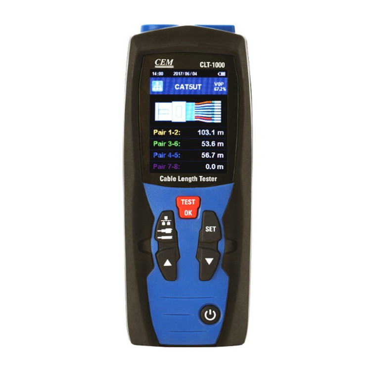 دستگاه سنجش طول کابل CEM CLT-1000 دستگاهی جهت اندازه گیری متراژ کابل بکار برده شده در مکان مورد نظر با قابلیت اندازه گیری از 5 تا 3 کیلومتر با اتصال کابل BNC , RJ45 می باشد. دقت بالا و اندازه گیری سریع ، کاربری راحت و آسان با صفحه دیجیتالی ، کنترل اتوماتیک ، قابلیت اتو رنج و صفر خودکار ، ال سی دی بزرگ و رنگی ، اندازه گیری و تست V.O.P و قابلیت ثبت 99 مقدار اندازه گیری شده توسط کاربر به همراه مکان مورد نظر از ویژگی های عمومی متراژ سنج کابل دیجیتالی مدل CEM CLT-1000 می باشد.