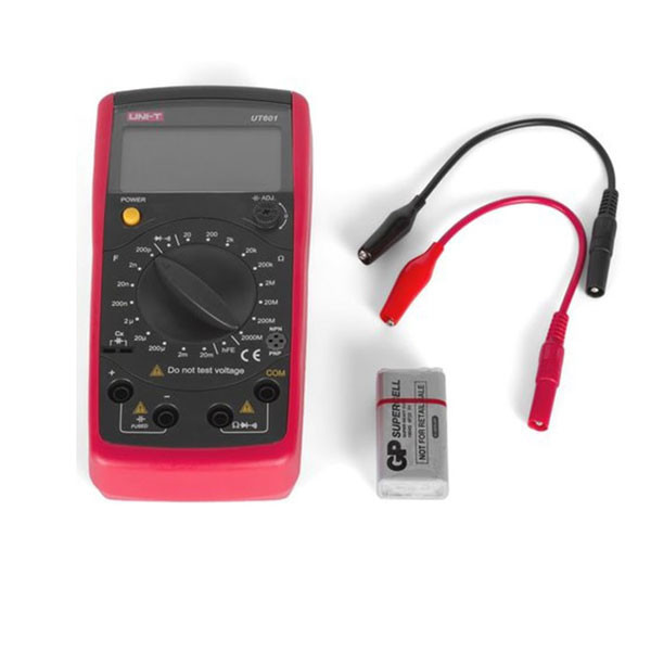 دستگاه خازن سنج برند UNI-T مدل UT201 برای اندازه گیری میزان ظرفیت خازن و مقدار مقاومت طراحی شده است .این خازن سنج از رنج پیکو فاراد تا 20 میلی فاراد و اهم مقاومت تا 2000 مگا اهم را اندازه گیری می کند .از دیگر امکانات دستگاه می توان به سوکت اتصال ترانزیستور برای اندازه گیری hFE ، سوکت مخصوص اتصال خازن ، تست دیود و تست اتصال کوتاه اشاره کرد . ولوم تنظیم دقیق نیز بر روی دستگاه نصب شده که دقت اندازه گیری را بیشتر و خطا اندازه گیری را صفر می کند.