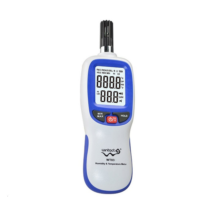 رطوبت سنج و ترمومتر وینتکت WINTACT WT83 توانایی اندازه گیری چهار پارامتر رطوبت، دما، نقطه شبنم و دمای حباب تر را دارد. این رطوبت سنج، دارای صفحه دیجیتالی است که توانایی نمایش همزمان دما و رطوبت را دار
