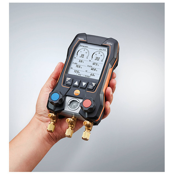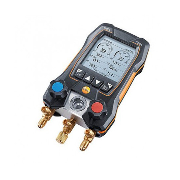 فشارسنج منیفولد دوقلو تستو TESTO 550s نشت یابی سریع و قابل اطمینان در سیستم های تبرید و پمپ های گرمایی میباشد.تستو مدل TESTO 550s ساخت کمپانی بزرگ آلمانی یک دستگاه منیفولد دیجیتال و کیت برودتی است که دارای بدنه آهنی مقاوم اطراف صفحه نمایشگر دارد که دستگاه را در برابر ضربه محافظت می کند.گیج منیفولد دیجیتال شارژ گاز تستو TESTO 550s به صورت دوقلو مجهز به دوشیر برای اندازه گیری فشار مخازن است.نمایشگر بزرگ تعبیه شده در این دستگاه به ارزیابی و تحلیل نتایج به صورت گرافیکی کمک می کند. برنامه های کاربردی و ذخیره شده بر روی دستگاه کاربر را در اندازه گیری و تشخیص پارامتر های بسیار مهم سیستم مانند گرم یا سرد کردن بیش از حد، گرم شدن بیش از حد هدف، ظرفیت سرمایش یا گرمایش و بسیاری دیگر یاری می رساند. پراب های بلوتوث برای دما، خلا و رطوبت به راحتی متصل می شوند و حداکثر انعطاف پذیری را در کار از خود نشان می دهند. این دستگاه قابلیت اندازه گیری مقادیر فشار از 14- تا 870 سای یا از 1- تا 60 بار و دما از 58- تا 302 درجه فارنهایت را داراست. کیت منیفولد 2 سوپاپ هوشمند برند تستو مدل TESTO 550S BASIC KIT شامل یک دستگاه منیفولد دیجیتال هوشمند testo 550s، پروتکل کالیبراسیون، کیت پراب کلمپی (با اتصال از طریق کابل) دما و کیف ابزار می باشد که به کاربر ارائه می شوند. این دستگاه کاربر را قادر می سازد تا در سیستم های برودتی، سیستم های تهویه مطبوع و پمپ های حرارتی اندازه گیری را با دقت و سرعت بالا انجام دهد. با ذخیره داشتن 60 نوع پروفایل مختلف مختص انواع گاز های خنک کننده و قابلیت های تست نشتی ، نشتی یاب منیفولد گاز های مبرد TESTO 550s را به یک دستگاه پر کاربرد برای کارهای مختلف تبدیل کرده است.همچنین شما می توانید مقادیر اندازه گیری شده را با استفاده از بلوتوث بر روی تبلت و گوشی های هوشمند مشاهده کنید و پس از آنالیز و بررسی داده ها می توان گزارشی را به صورت ایمیل ارسال کرد.