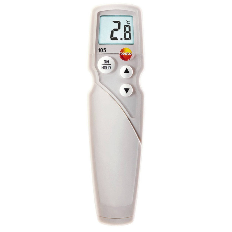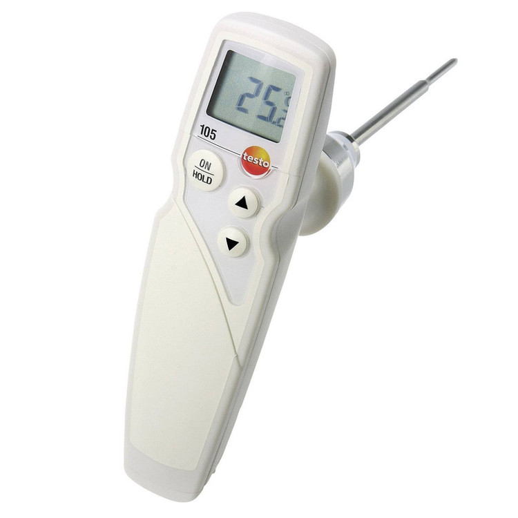 دماسنج و ترمومتر گوشت تستو مدل TESTO 105 با کد محصول 05631051 یک ترمومتر دیجیتال مخصوص غذا است .تستو 105 طوری طراحی شده که قابلیت اندازه گیری دمای انواع غذای منجمد شده و معمولی را دارا می باشد. از ویژگی های دیگر تستو 105 می توان به کاربری راحت، طراحی منحصر به فرد، نور پس زمینه، آلارم صوتی و دیداری و گیره دیواری اشاره کرد. دماسنج تستو 105 دارای پراب IP65 است که می توان بدون هیچ مشکلی در زیر آب استفاده کرد.