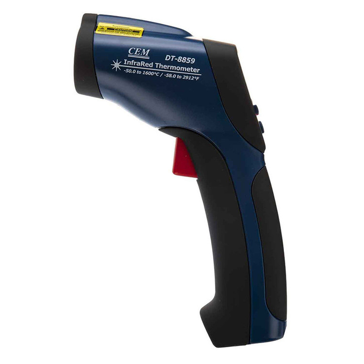 ترمومتر لیزری 1600درجه مدل CEM DT-8859 اندازه گیری دما، بصورت غیرتماسی (لیزری)، در محدوده -50 تا 1600+ درجه سانتی گراد با دقت 1 درجه سانتیگراد با نسبت فاصله لیزری 50 متر تا جسم، با لمس یک دکمه انجام می شود.دماسنج لیزری سم مدل CEM DT-8859 با زمان پاسخگویی بسیار کوتاه و قابلیت انتخاب واحد بر اساس درجه سانتی گراد یا فارنهایت از بهترین انواع دستگاه های ترمومتر لیزری است. از این ترمومتر برای دریافت درجه حرارت از مناطق غیر قابل دسترس، اهداف متحرک و برای نظارت بر گرما در نقاط مختلف محیط استفاده می شود. در این دماسنج لیزری، دو نقطه لیزر جهت اندازه گیری دقیق تر تعبیه شده است .
