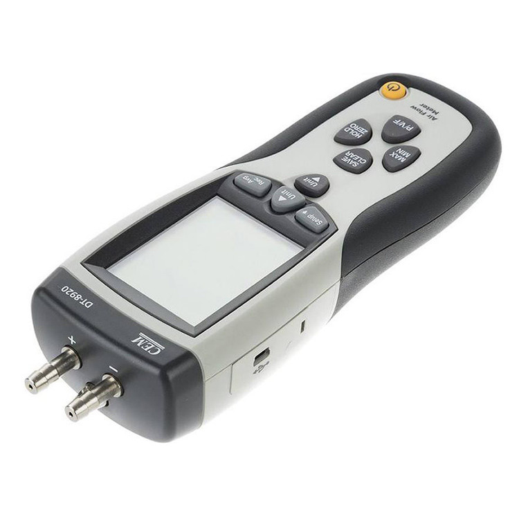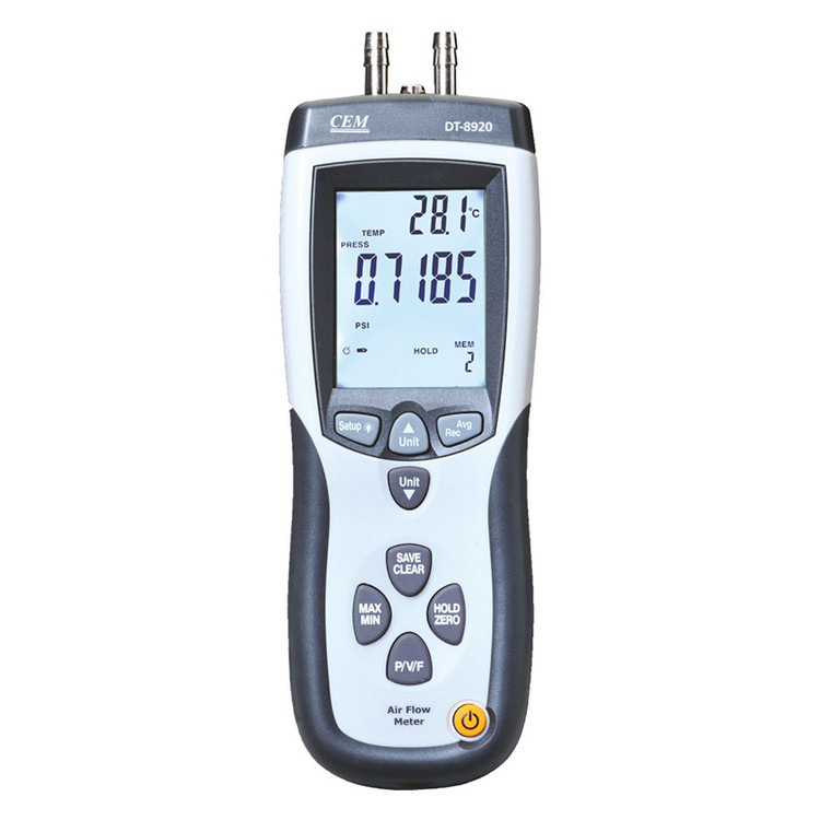 فشار سنج تفاضلی سم CEM DT-8920، فشارسنج تفاضلی و سرعت سنج باد با دقت بسیار بالا، اندازه گیری فشار و اندازه گیری سرعت باد را براساس 5 واحد در صفحه نمایش LCD برای کاربران با دقت و زمان پاسخ بالا نمایش میدهد. فشار هوا را میتواند بر مبنای کلید HVAC (سیتم های تهویه مطبوع) مانیتور کند و کیفیت هوا را بخوبی حفظ کند. اندازه گیری فشار و سرعت یا فلو هوا را با قابلیت تنظیم صفرو همچنین نمایش فشار، سرعت و فلو هوا بعلاوه دمای محیط بصورت همزمان از ویژگی های این محصول است. همچنین دستگاه فشار سنج تفاضلی سم CEM DT-8920 ،اندازه گیری سرعت باد که محدوده اندازه گیری فشار آن در محدوده ۵۰۰۰ Pa بوده و محدوده اندازه گیری سرعت هوا در بازه ۱ تا ۸۰ متر بر ثانیه می باشد. بنابراین شما می توانید فشار تفاضلی و سرعت هوا را اندازه گیری کرده و مقادیر حاصل را بر روی صفحه نمایش LCD دستگاه مشاهده نمایید. علاوه بر اندازه گیری این دو پارامتر کمیت های دیگری مانند فلوی هوا (CFM/CMM) و دمای هوای عبوری با استفاده از این فشارسنج تفاضلی و سرعت سنج باد CEM قابل اندازه گیری است.