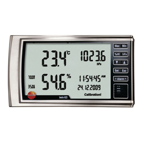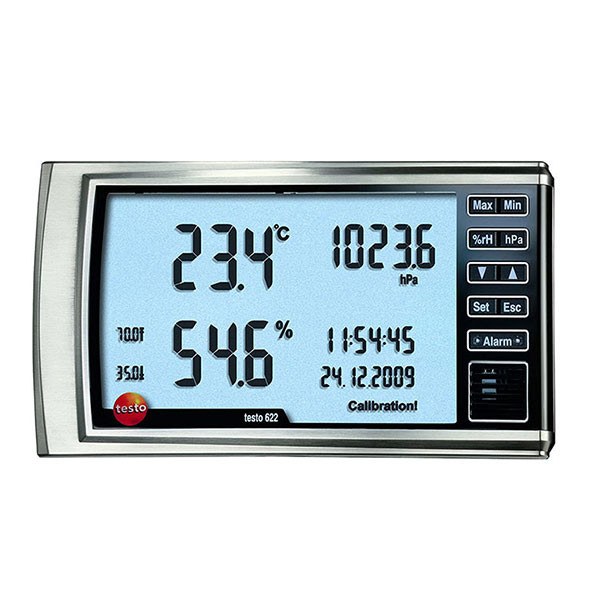 دما رطوبت فشارسنج تستو مدل TESTO 622 با پارت نامبر 6220 0560 دستگاهی چند منظوره است که میتواند دما و رطوبت محیط بعلاوه فشار محیطی را در یک نمایشگر چند گانه به صورت همزمان نمایش دهد. برای افزایش کارایی این فشار سنج محیطی ، تاریخ و ساعت نیز در قسمتی از نمایشگر دستگاه تعبیه شده است. این دستگاه هم به صورت رومیزی و هم به صورت نصب بر روی دیوار قابل استفاده است. از آنجایی که سه پارامتر دما رطوبت و فشار یکی از سه عوامل تاثیر گذار هستند لذا در محیط هایی همچون آزمایشگاهها و محیط های کارگاهی و صنعتی این سه پارامتر میتواند تاثیر گذار باشد. دماسنج ، رطوبت سنج و بارومتر رومیزی تستو TESTO 622 ترموهیگرومتر TESTO 622 ابزاری ایده آل برای مانیتورینگ هوا ، به ویژه در آزمایشگاه ها ، با دقت بالا برای اندازه گیری دما و رطوبت وفشار هوا در ادارات، فضاهای زندگی و ساختمان های تجاری شما رافراهم می کند . ترموهیگرومتر و بارومتر تستو مدل TESTO 622 ساخت کمپانی تستو آلمان است. دما رطوبت و فشار سنج محیطی تستو TESTO 622 محدوده اندازه گیری دما تستو TESTO 622 از 10- تا 60+ درجه سانتی گراد با دقت 0.4± درجه سانتی گراد قرار دارد. محدوده اندازه گیری سنسور رطوبت از 0 تا 100% RH با دقت RH 2% ±می باشد و رنج اندازه گیری فشار در محدوده 300 تا 1200 هکتوپاسکال می باشد.