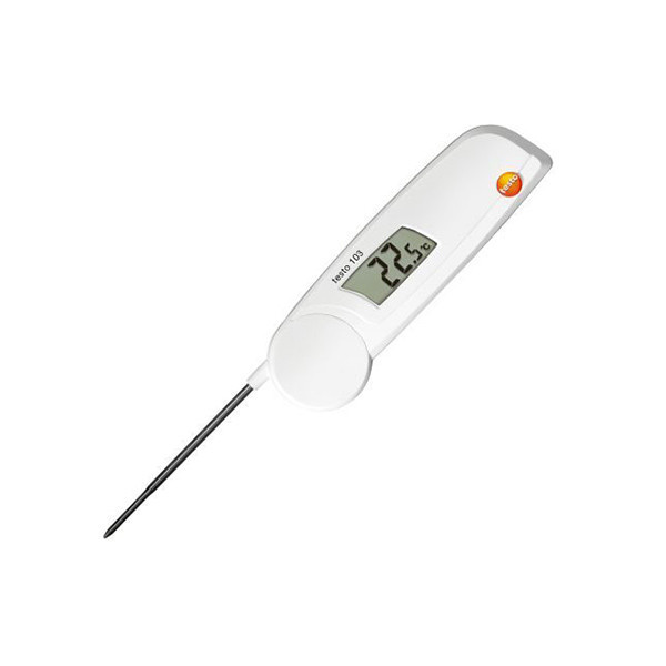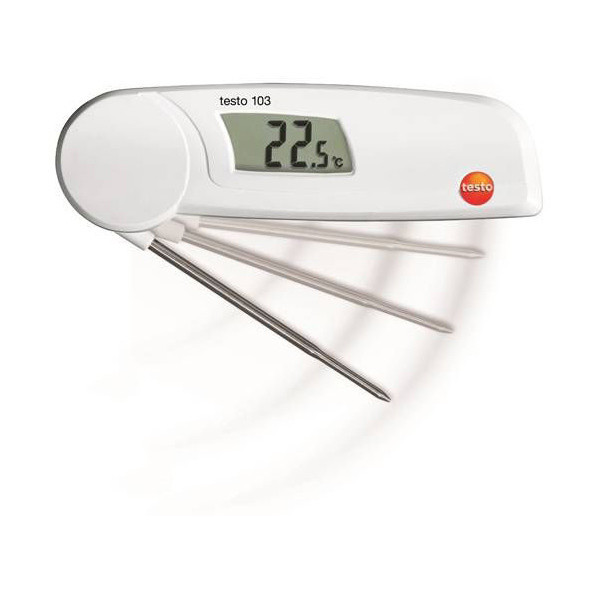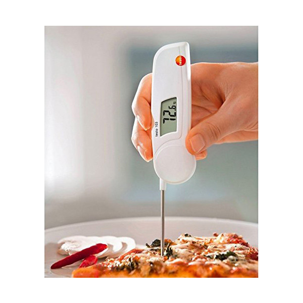 دماسنج نفوذی/میله ای مواد غذایی مدل TESTO 103 یک دماسنج تماسی یا میله ای به صورت تاشو ، سبک و کوچک است که بیشتر جهت اندازه گیری دمای مواد غذایی مورد استفاده قرار می گیرد. در سر میله ی این دستگاه یک سنسور قرار دارد که دما را اندازه گیری میکند و به محض گشودن میله دماسنج روشن می شود . این دماسنج میتواند برای استفاده در آشپزخانه ها و آشپز های حرفه ای بسیار مناسب باشد. دماسنج غذایی TESTO 103 یک دستگاه برای اندازه گیری مقدار درجه حرارت در محدوده اندازه گیری ۳۰- تا ۲۲۰ درجه سانتی گراد با دقت اندازه گیری بالا و یکی از کوچکترین مدل ها در بین دماسنج های تاشو می باشد . به این ترتیب همیشه این دماسنج در دسترس کاربر است و می تواند در هر مکانی آن را به همراه داشته باشد . پراب این دماسنج غذایی تستو را می توان پس از فرایند اندازه گیری به راحتی از دستگاه جدا کرد و بسیار مناسب برای اندازه گیری دمای مواد غذایی و همچنین مورد استفاده در فرآیند های تولید و ذخیره کالاهای غذایی و همینطور به منظور حصول اطمینان از حفظ کیفیت و استاندارد های بهداشتی مواد غذایی می باشد .