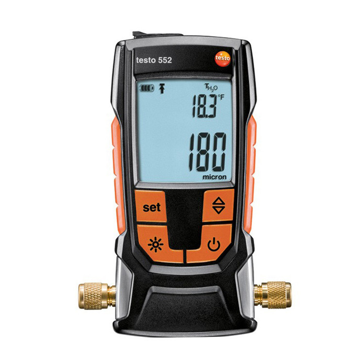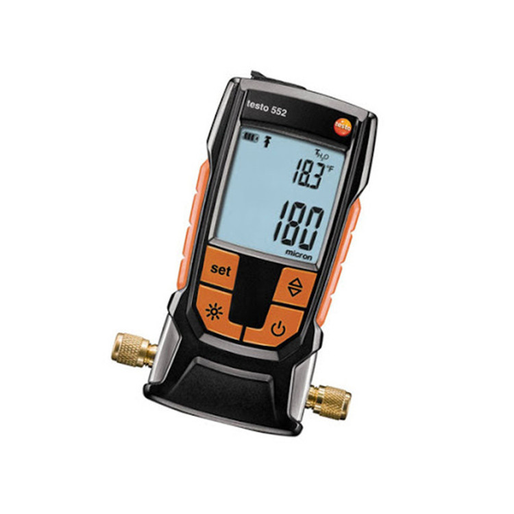 گیج وکیوم و خلاء دیجیتال تستو Testo 552 یا گیج وکیوم دیجیتال شارژ گاز کولر بلوتوثی تستو TESTO 552 با نمایش مثبت مقدار فشار خلا بر خلاف گیج های فشار منفی میتواند مقدار فشار خلا را با بیشترین دقت تا رنج 20000 میکرومتر جیوه اندازه گیری کند. مهمترین قابلیت این وکیوم متر دیجیتال قابلیت اتصال به صورت بی سیم از طریق بلوتوث بوده که با دانلود اَپ Smart Probes به صورت رایگان میتوانید مقادیر اندازه گیری شده را بر روی موبایل یا تبلت مشاهده کنید و به کمک نرم افزار آنها را ذخیره سازی کرده و از طریق اینترنت ارسال کنید. نمایشگر بزرگ با نور پس زمینه ، بدنه محکم ، قابلیت تنظیم هشدار و درجه حفاظت IP42 از مهمترین مشخصات فیزیکی این گیج وکیوم دیجیتال است. علاوه بر واحد میکرون این دستگاه واحدهای دیگری از جمله mbar; micron; mmHg; Torr; inHg; inH20; hPa; Pa را میتواند نمایش دهد. از مهمترین کاربردهای این خلاسنج دیجیتال بلوتوثی استفاده در تخلیه سیستم های خنک کننده و تبریدیبه هنگام شارژ گاز کولر های گازی در هنگام راه اندازی مجدد و همچنین پمپ های گرمایی است زیرا که در راه اندازی مجدد سیستم های خنک کننده و یا سیستم های تهویه مطبوع باید به صورت کامل سایر گازهای سیستم ، رطوبت و روغن حذف شده باشند و این زمانی محقق میشود که فشار مطلق سیستم با دقت بالا اندازه گیری شود.Testo 552گیج وکیوم دیجیتال نه تنها فشار را اندازه گیری می کند، بلکه میتواند دمای تبخیر آب را محاسبه کند و این به این معنی است که شما می توانید به سرعت بررسی کنید که آیا رطوبت در سیستم تبخیر می شود یا خیر.