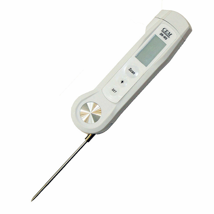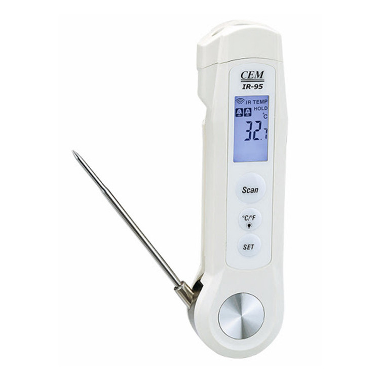 دماسنج نفوذی تاشو/غیرتماسی CEM IR-95 یک دماسنج غیرتماسی لیزری(مادون قرمز) و تماسی توسط پراب برای خواندن دمای نفوذی، بخصوص در مواد غذایی و پخت و پز استفاده میشود. دارای شمارشگر معکوس تا زمان پایان پخت و قابلیت اندازه گیری دما میباشد. دارای صفحه نمایش باکیفیت و واضح جهت نمایش اطلاعات، و همچنین دستگاه دارای استاندارد ضد آب و غبار IP67 است. امروزه انواع دستگاههای اندازه گیری دما با نامهای دماسنج تماسی و غیر تماسی که دماسنج های تماسی بصورت سنسور دار و سیمی و ترمومتر میله و ترمومتر نفوذی و ترمومتر غیر تماسی به صورت لیزر یا اینفرارد اختراع و مورد استفاده قرار گرفته است ترمومتر غیر تماسی در انواع مختلف با دما و دقت های مختلفی با قابلیت اتصال به کامپیوتر و ثبت مقادیر در حافظه خود برتری را برای استفاده از داده ها برای کارشناسان و مهندسین فراهم ساخته است. این ترمومتر با توجه به کیفیت ساخت بالا از قیمت مناسبی به نسبت سایر برند ها برخوردار است.